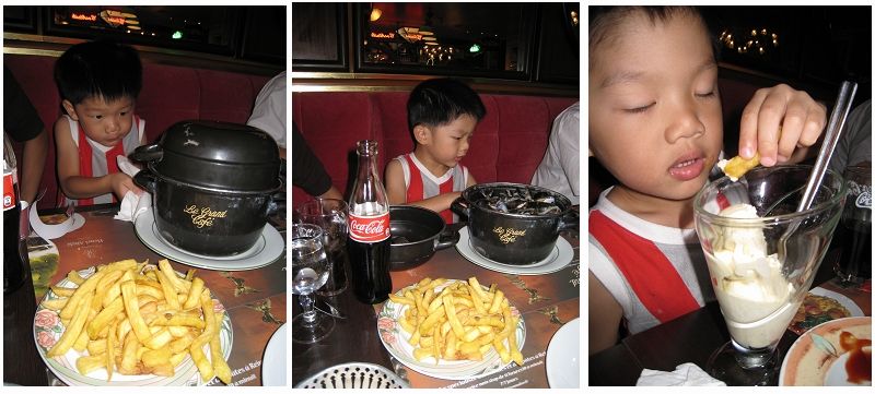 一鍋的黑色的蛤蟆加上一整盤的薯條